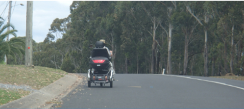 A motorised wheelchair/scooter user is encouraged to plan a route that allows access to a footpath for the entire journey and to avoid roads. They are advised that, if forced to use roads, travel on quieter streets.