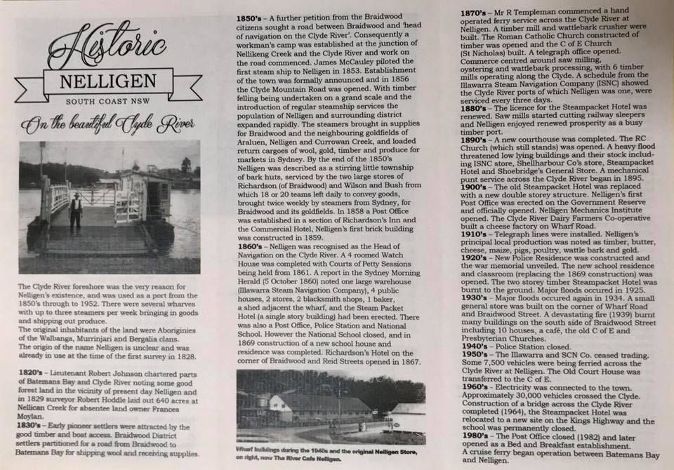 An Historic Nelligen brochure has been produced by members of the Nelligen Progress Association for the benefit of visitors to the area and will be placed with local tourist information locations. Thanks to Betty, Elaine and Rita for your contribution, and to Jenny for set out and artwork compilation. The River Cafe Nelligen has the brochures.