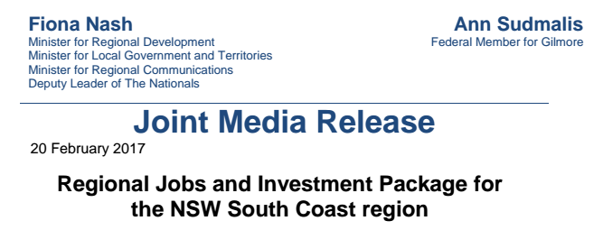 Minister for Regional Development Fiona Nash together with Member for Gilmore, Ann Sudmalis announced the NSW South Coast Jobs and Investment Packages (RJIP) Local Planning Committee today.