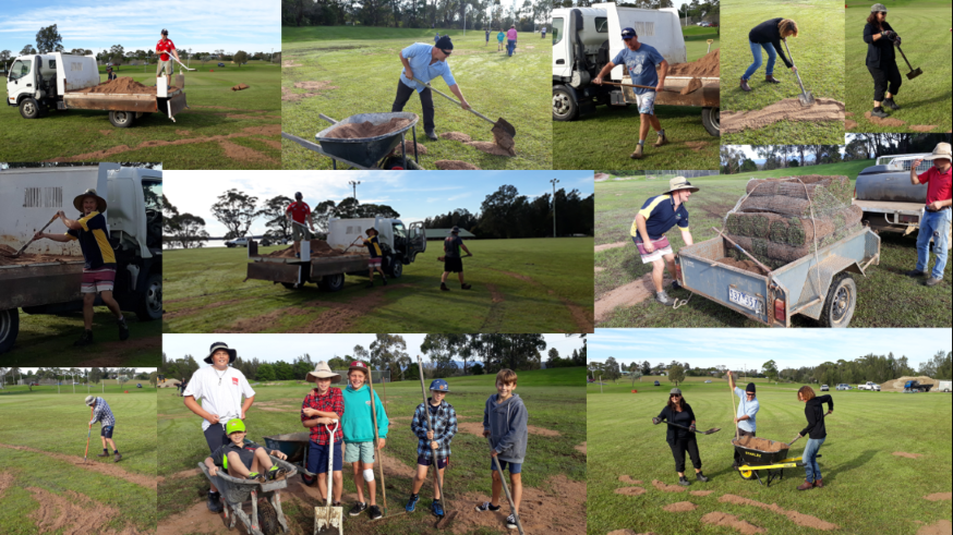 However the Broulee Moruya Australian Football Club have just carried out a Working Bee this morning laying turf, rolling and topdressing the damaged areas on the ground under sunny skies that should dry out the pitch and make it more than playable for the first games of the season starting on April 29th.