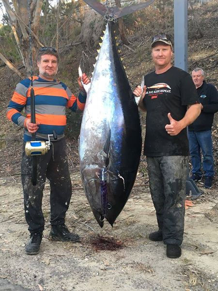 Record Bluefin caught out of Batemans Bay! Well there you have it! Andrew Hooch Turner and Richie Rich caught one of the biggest bluefin tuna on a rod and reel in Australia! Coming in at a massive 168kg you can say that is a true jumbo. The bluefin bite has been a bit patchy but still has been worth the effort especially if you catch and land a monster like a 168kg fish. There was a hot bite on Thursday the 29th of June not far out on the 150 30 line wide of Bermi with thick schools of fish around the 30 to 40 kg mark then we were hit with a bit of weather which kept the boats in till the following Sunday July the 2nd; a date that will be etched inside these boys heads for life. The Batemans Bay lads woke up early that morning in hope of some bluefin action and uncertain if the fish would be there as these fish are known to move quickly with the currents from place to place, finding food and oxygenating their gills. These fish have a high oxygen demand and that’s why they swim with their mouth open forcing water past it’s gills in a process called ram ventilation. Whereas other fish have a separate pump that stream water over the gills. So the bluefin have to keep swimming to allow water to pass over the gills which is 30 times more surface area then other fish. The water temperature can be important also as the oxygen concentration in the water changes with the temperature, being lower at higher temps. The bluefin are comfortable in 17 to 20 degrees and are known to endure as low as 3 degrees and as high as 30 degrees when spawning. Bluefin also require water to be relatively high in salinity in order to keep equilibrium of the ions within their body. Due to the bluefin's high metabolic need ions must be taken up relativity quickly to ensure sufficient concentrations for cellular function and they do this by drinking the water that is high in salinity. This regulation of internal ion concentration classifies southern bluefin tuna as osmoregulators. And the boys that morning, as they were fuelling up, kept this in mind. They knew those pesky osmoregulators could be anywhere by now. But what always helps during bluefin season is lots of boats on the water with radios. So after a couple of days of bad weather the boys were out there and the search was on. It wasn’t too long and they were found just east of the northern sea mount. Hooch and Richie were close by and so were quite a number of boats which meant it wasn’t too long before a heap of pillies were dumped into the water. Immediately, the most important thing to do is to start cubing pillies. The bluefin can be a bit flighty at times and may come to a couple of cubes and then go down and can disappear. Once they are getting fed and there’s more food to grab and the rest of the school begins feeding they can settle into a feeding mode which can keep them up for hours. So our boys Hooch and Richie were amongst the action having the time of their lives but after a not-too-long while the bite turned off. Some say Pino on “Freedom” scared them off, some say the divers scared them off, some say Jem Abbott's loud heavy metal music scared them off. I’m not here to start rumours but I reckon it was Justin Westbury. He wasn’t there but the thought of him heading out would of scared the bluefin away. I don’t know why he isn’t called banana by now hahaha. Anyway the bluefin bite seemed to have switched off just as the wind started to pick up a bit. The fish seemed to have bit on the tide change and I don’t know but I never seem to catch bluefin when it’s rough, yellowfin yes, they love the rough. But I only seem to catch bluefin on calmer days and I have noticed the tides are to go by also. Fish are like humans; they have breakfast lunch and dinner. They don’t feed all day long, they feed at particular times and the tides can play a major role in this... so fish around the tides. So once the bite died down Hooch and Ritchie decided to pull up and start trolling again. As they trolled away Richie decided to grab the biggest ugliest black and purple lure he could find rigged with double hooks and looked at Hooch and said "Lets run this"... , Hooch was like,” Aww I don’t know man, looks pretty bloody big, if anything hits it then we are in trouble”. So Ritchie likes trouble and tossed it in the spread. As all the other boats are burning towards where the action was in hope of there still being a fish wanting to play the boys were trolling the opposite direction away. It’s known for the bigger fish to be swimming around the outside of the smaller school fish so it makes sense that once they got some distance away from the main school the reel started to scream and they saw it was the massive lure that was hit and they instantly knew they were into something big. An hour later it was boat side and found to be hooked in the side. So when this big bluefin came up to take a swipe at the lure it must of missed and copped it in the side and being so big with thick skin the lure stayed in. The boys were over the moon once the gaff was in but next was the task of getting it in the boat. With help from another boat and Pino jumping on board they eventually got it on deck. The boys were elated and were not quite sure of the enormity of the fish. First thinking about 90kgs, then over 100kgs then finally estimating around 150kgs. It had a head on it the size of a 44 gallon drum, it was a big puppy. Once it got to the weigh station it pulled 167.8kgs and the heaviest southern bluefin world record is 178kg after that its 167.5kg so if Hooch was affiliated he would of taken second heaviest southern bluefin tuna caught in the world. Fish of a life time boys.