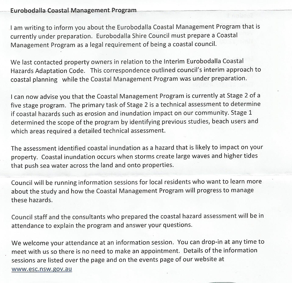 That’s right – the Act hasn’t been formally adopted. Why? Many believe that because a 'cornerstone' of Liberal Party policy is property rights, given the threat that the 'proposed' SEPP (State Environmental Planning Policy) poses to property rights the government might be having second thoughts. Minister Roberts assured the NSW Coastal Alliance(NCA) that he would strongly oppose the SEPP in its current form. He then put a 'hold' on the SEPP in late 2016 and has still 'held his ground' and the SEPP still can't get through nearly a year later. However, that doesn’t appear to phase Eurobodalla Council as they continue to spend considerable funds on proceeding with the principles of an unadopted SEPP while adhering to all its guidelines. By showing the new maps ( based of the 'stopped' SEPP) to the public, without advising the public that the SEPP has not been adopted, Council are, if fact, creating the illusion to the public that the NSW Liberal Govt has all but forsaken property rights and have authorised the SEPP along with all of its accompanying documentation, process and consequences. And that is NOT the case. There also appears to be considerable Council confusion elsewhere as to whether the Act has been adopted or not. In the recent submission ( http://bit.ly/2gj7qAK ) by Council to the RMS in regards to the new Batemans Bay bridge it states: Wharf Road has been identified by the NSW Government as a coastal erosion hot-spot. Council has prepared a Coastal Zone Management Plan (CZMP) for this precinct that will guide how the erosion hazard is managed. The plan is currently with the Minister for Environment awaiting certification under the NSW Coastal Management Act 1979. The key action in the plan is for the NSW Government to purchase private land that is at immediate and ongoing risk from coastal erosion and shoreline recession. NSW Department of Planning will be responsible for this action and have endorsed the CZMP prior to Council seeking certification from the Minister. When implemented, this will provide public open space that can also be utilised as a buffer to manage public infrastructure. Once the land is in public ownership, Council will have options on how to maintain access to the Wharf Road area. Management options include: