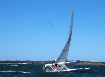Two races were held, and in Division 1 both races developed into tussles between Chili (Anna and Ben Woolnough) and Knockout (Rob Currall) for line honours. The faster boat Knockout would take the lead but some mishap would then let Chili through to hit the front. Meanwhile the larger, slower Tradewind (Allan Rees and Dave Gibson) was sailing consistently and very competitively despite a rigging problem which prevented them from using their spinnaker.