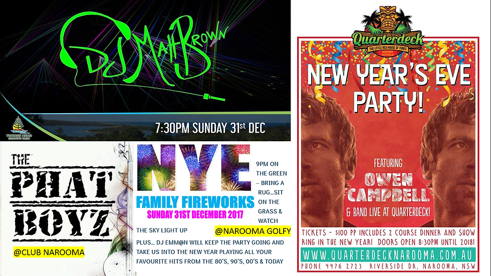 Dec 31st - Nashberries @ Moruya Bowling Club Dec 31st - Spicy Fruit Chutney @ The Tuross Tav Dec 31st - DJ Matt Brown @ Tuross Head Country Club Dec 31st - Tony Jaggers @ Bodalla Dairy Shed (noon) Dec 31st - Owen Campbell @ The Quarterdeck Narooma for NYE