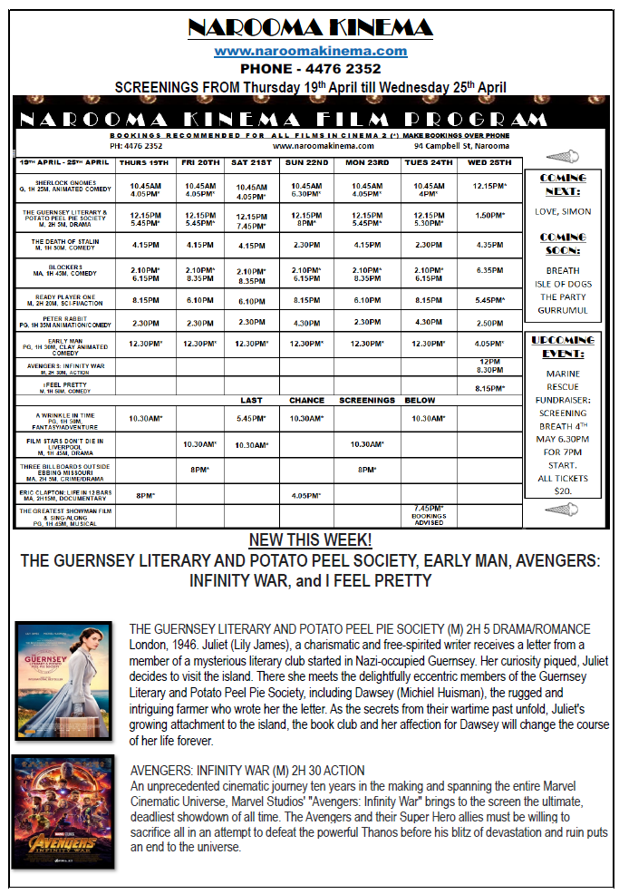 This Weeks new films are THE GUERNSEY LITERARY AND POTATO PEEL SOCIETY, EARLY MAN, AVENGERS: INFINITY WAR, and I FEEL PRETTY.