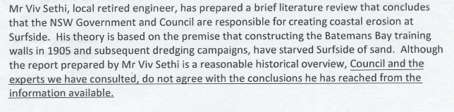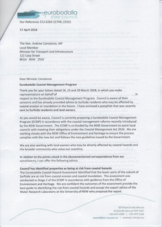 Please read the attached letter (above), written by Council and signed by the G.M., that was sent to a Surfside resident via Minister Constance. Note that the letter is dated 17 April,2018, two weeks before the meeting at Wharf Road with Council staff, councillors,the Mayor and community members and 3 weeks before the meeting with the NSW Coastal Alliance Eurobodalla and NSW Coastal Alliance. The letter plainly states that "council and the experts we have consulted, do not agree with the conclusions" of my report.