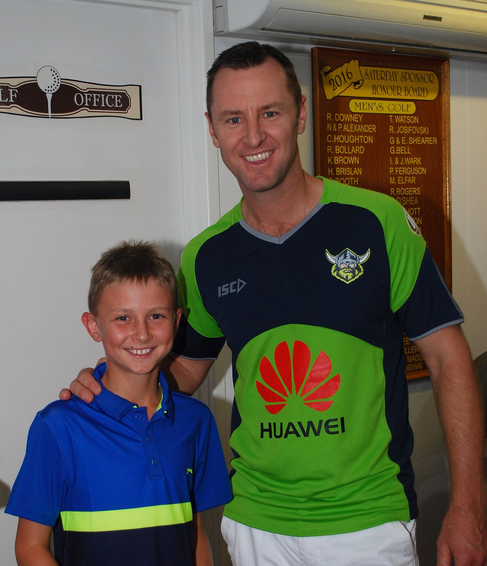 Above: Lachlan Nordsvan with PGA golfer Brendan Jones on a previous visit to Tuross Head.