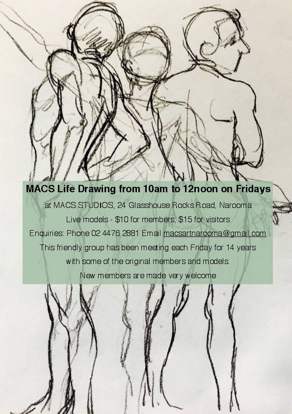 For 14 years Montague Art and Craft Society Life Drawing Studio Group has been meeting each Friday from 10am until 12noon. Two of the five regular models, and some members, have been with the group for that whole time. The session starts with about five quick 2-minute poses, a few 5-minute poses, and a few 10-minute poses. Then a short break for morning tea/coffee and a chat. In the second half there are some longer poses, perhaps a 10-minute, a 15-minute, and a 20-25 minute pose. There is a life model each week and usually around six to ten people to draw at either easels or tables. Friday morning is an untutored session, but Life Drawing Workshops are held from time to time, usually on a weekend. Attending life drawing sessions is good preparation for doing a Life Drawing Workshop. So what is the value of life drawing? Especially in the quick poses, there is no time to think. There is just time to get a few descriptive lines onto the paper. The focus is on quickly seeing where the shapes are and how they interact. No time to make a perfect drawing. Just a few lines that capture the pose. The large range of possible poses of the figure forces the artist to deal with foreshortening, one of the most difficult aspects of drawing. A foot in the foreground has to be drawn illogically large to look correct. And too, because the proportions of the human figure are really familiar, the drawing needs to be accurate. With a tree or a flower, the drawing just has to look believable once away from the original. A drawing of the human form finds it harder to pass the ‘believable’ test. In short, life drawing is a great way for beginners to quickly hone their seeing skill and therefore their drawing skill. Life drawing is good training for general drawing, and experienced artists use life drawing as ‘ongoing maintenance’ for their drawing skill. Historically there is a mystique to life drawing - Academy and all that. Here on the ground in Narooma, MACS members “just want to draw”. Mostly the drawings produced in studio are not intended to be finished work, so beginners have no need to be concerned - no one looks at what others are doing. All present and past members of MACS Life Drawing Group are invited to the 14th Birthday Party of MACS Life Drawing at MACS Studio, 24 Glasshouse Rocks Road, Narooma at 12 noon on Friday 28 September