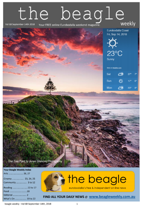 Your FREE glossy Beagle Weekender - Volume 68 is now available for your weekend reading pleasure The Beagle Weekender : bringing you great weekend reading along with all that is happening around the Eurobodalla Shire in Arts and Entertainment, Food, Cinema, History and Reviews and the best What's On Guide on the coast. PREFER TO see the Weekend news on your MOBILE PHONE Click HERE For those who prefer to scroll up and down with a .pdf version it is available HERE or click on the image below