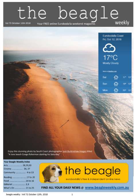 Your FREE glossy Beagle Weekender - Volume 72 is now available for your weekend reading pleasure The Beagle Weekender : bringing you great weekend reading along with all that is happening around the Eurobodalla Shire in Arts and Entertainment, Food, Cinema, History and Reviews and the best What's On Guide on the coast. PREFER TO see the Weekend news on your MOBILE PHONE Click HERE For those who prefer to scroll up and down with a .pdf version it is available HERE or click on the image below