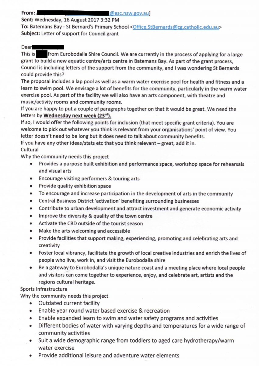 As previously stated in the letter to Mr X, it was demonstrated in the Initial Application from Eurobodalla Shire Council that this project has extensive support from the community. I note that a letter of support was not provided by the Batemans Bay Swimming Club with the Initial Application.