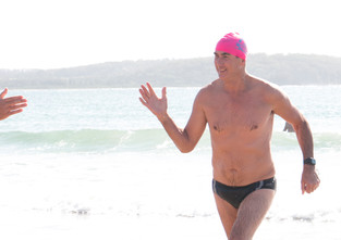 Happy vibes permeated the sand and the water. Antionette, freshly arrived from a village outside Dublin and doing her first ocean swim, simply smiled her way out of the water and onto the finish line. Clint Picken from Canberra, second in the over thirties, beamed as his step daughter Decoda met him in the shallows with a prosthetic leg to help with the run to the finish line.