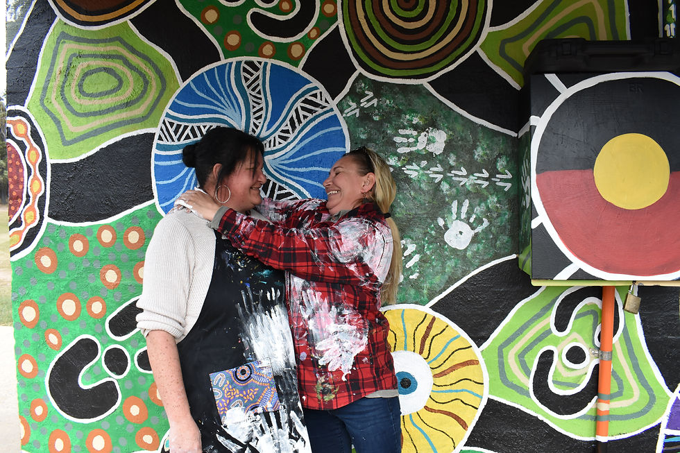 Above: Mogo artist Bronwen Smith with her cousin Kizzy Nye, who inspired Bronwen’s family-themed mural on the Mogo recreation park amenities building.