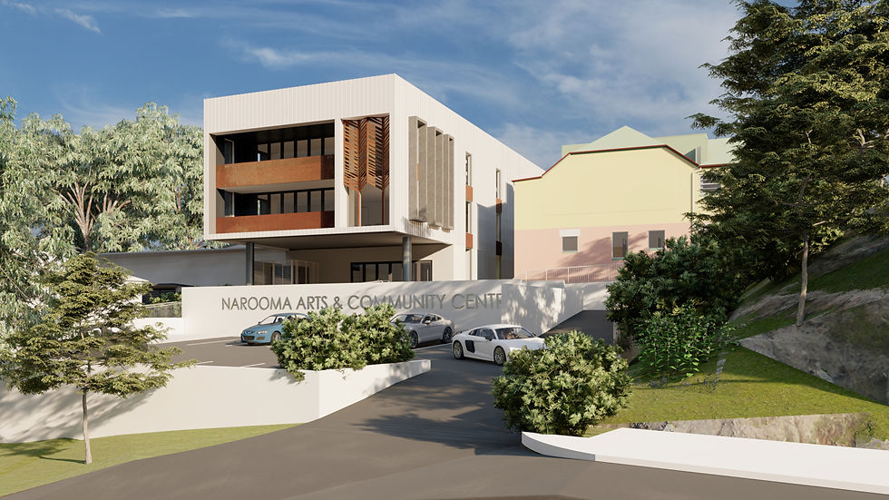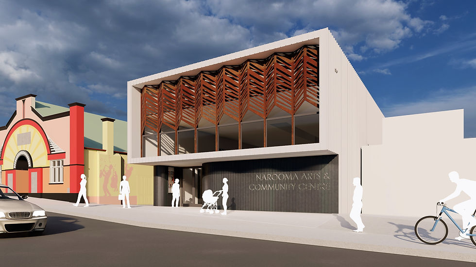Above: The proposed Narooma Arts & Community Centre facing Bowen Street. Courtesy ClarkeKeller.