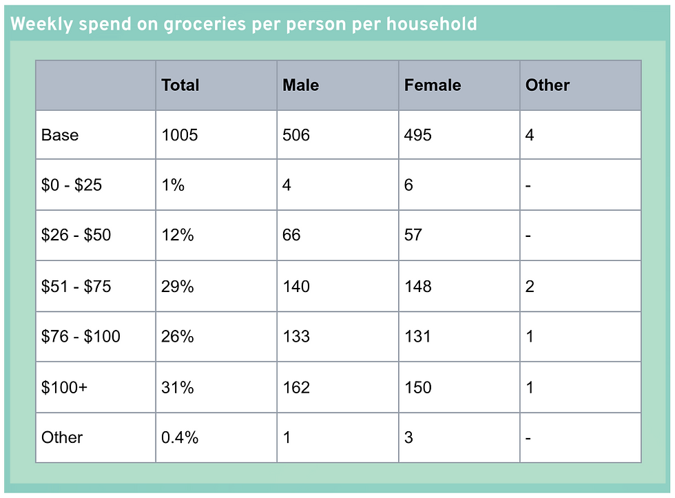 The survey revealed that 31.1% said they spend over $100, which could mean 6.05 million Australians are spending over $100 per person each week on groceries.